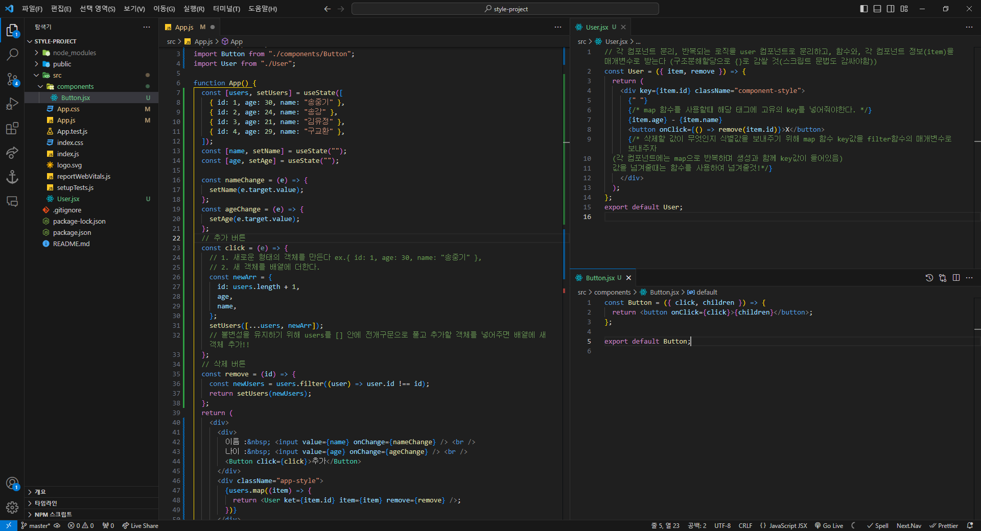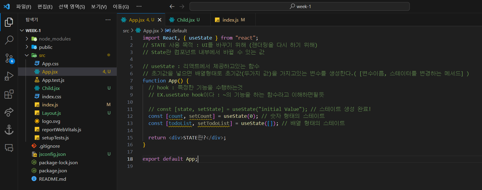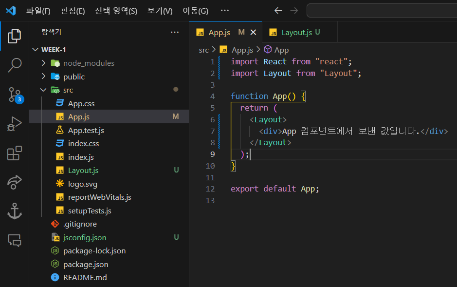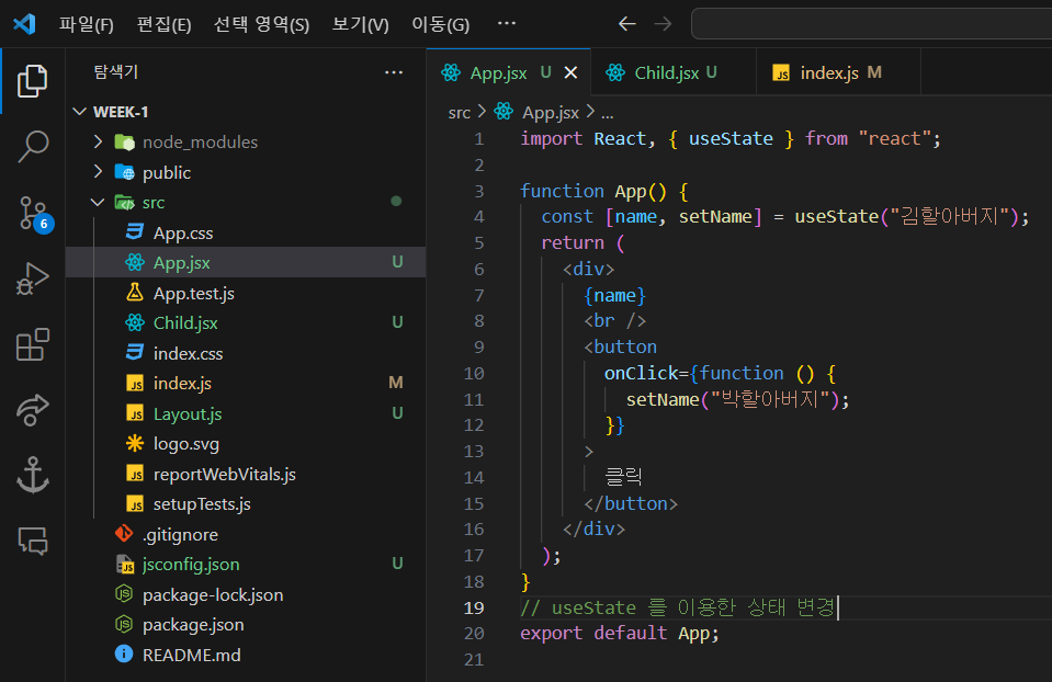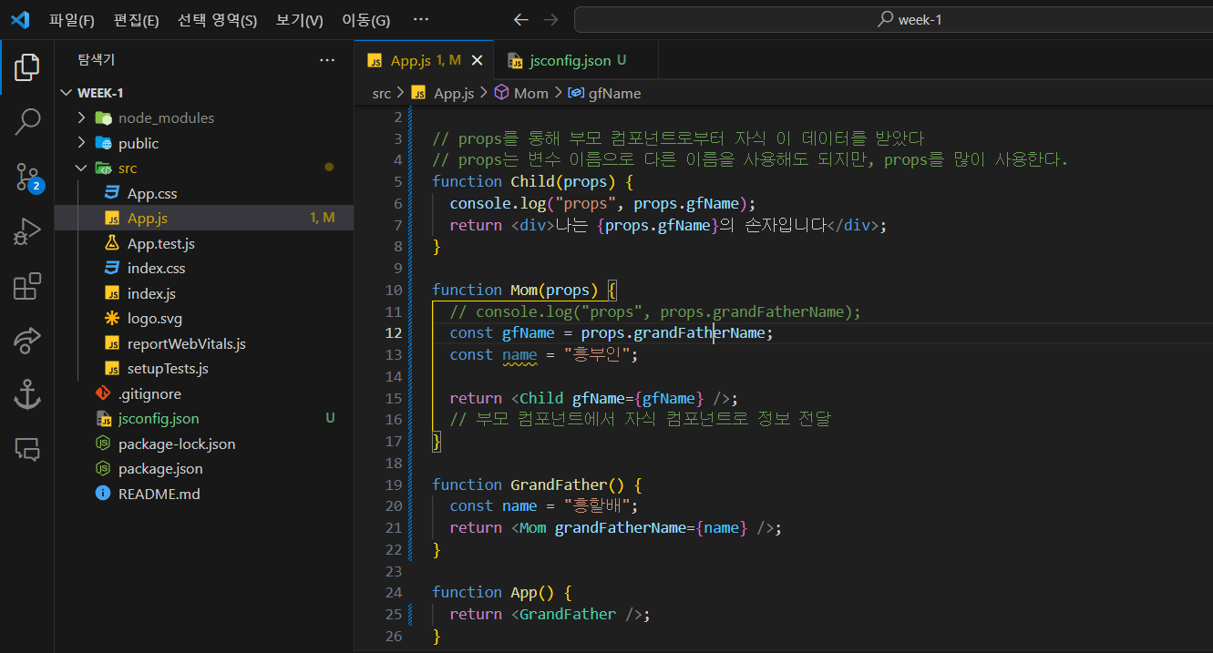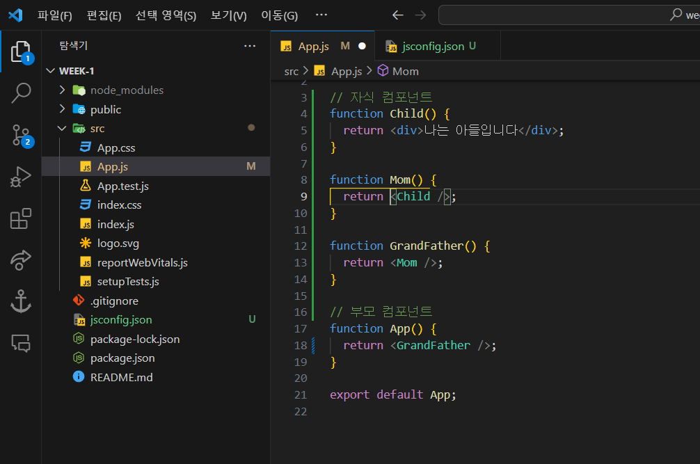 - 값을 보낼 부모 컴포넌트의 return에 자식 컴포넌트를 입력하면 부모, 자식 컴포넌트가 서로 연결되어 "나는 아들입니다" 메세지가 화면에 나온다