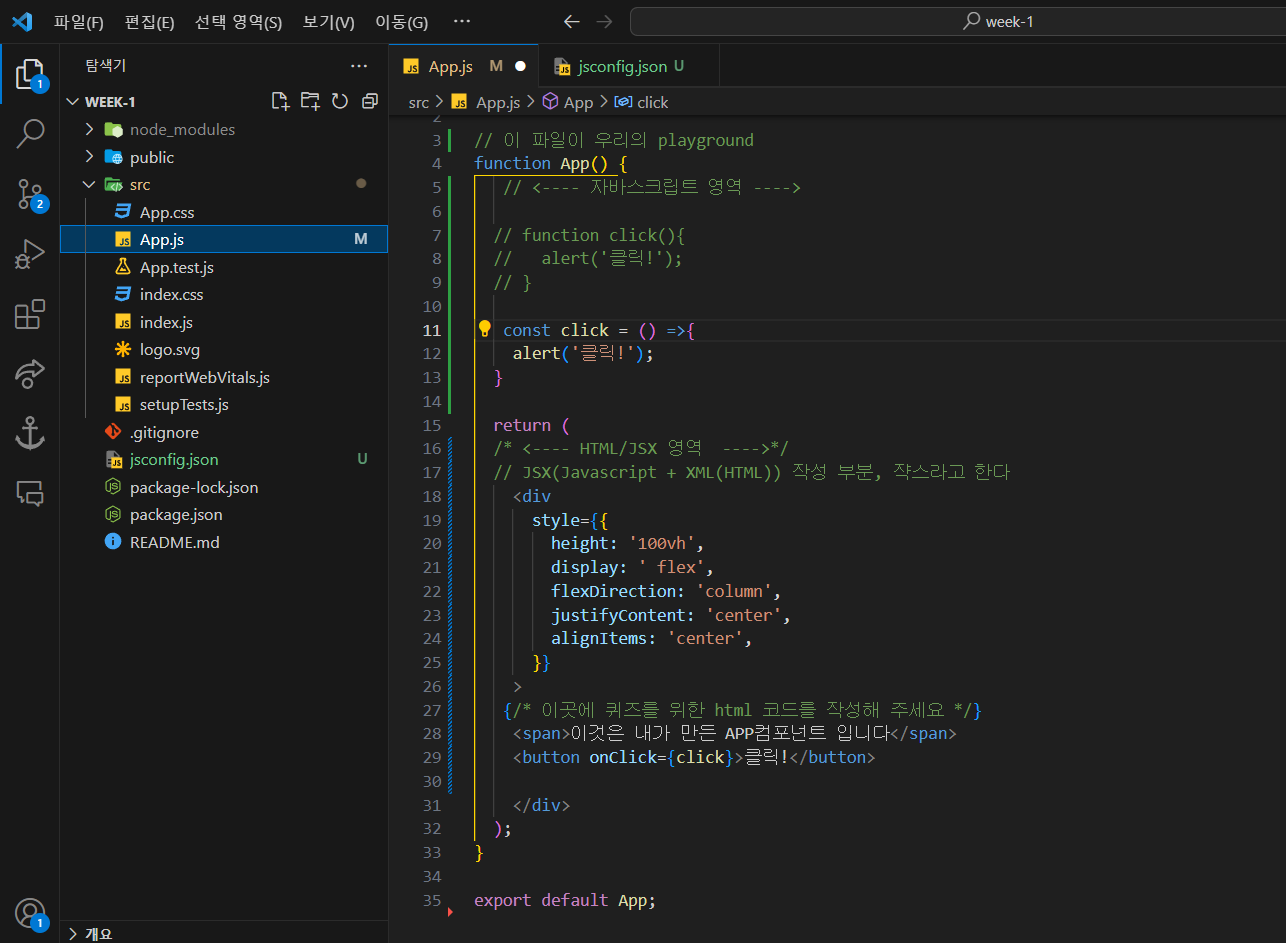 - onclick={(e) =>{ alert('이벤트'); }} 인라인으로 직접 이벤트를 작성해줘도 되지만, 함수를 작성하여 컴포넌트에 함수를 연결해주었다
