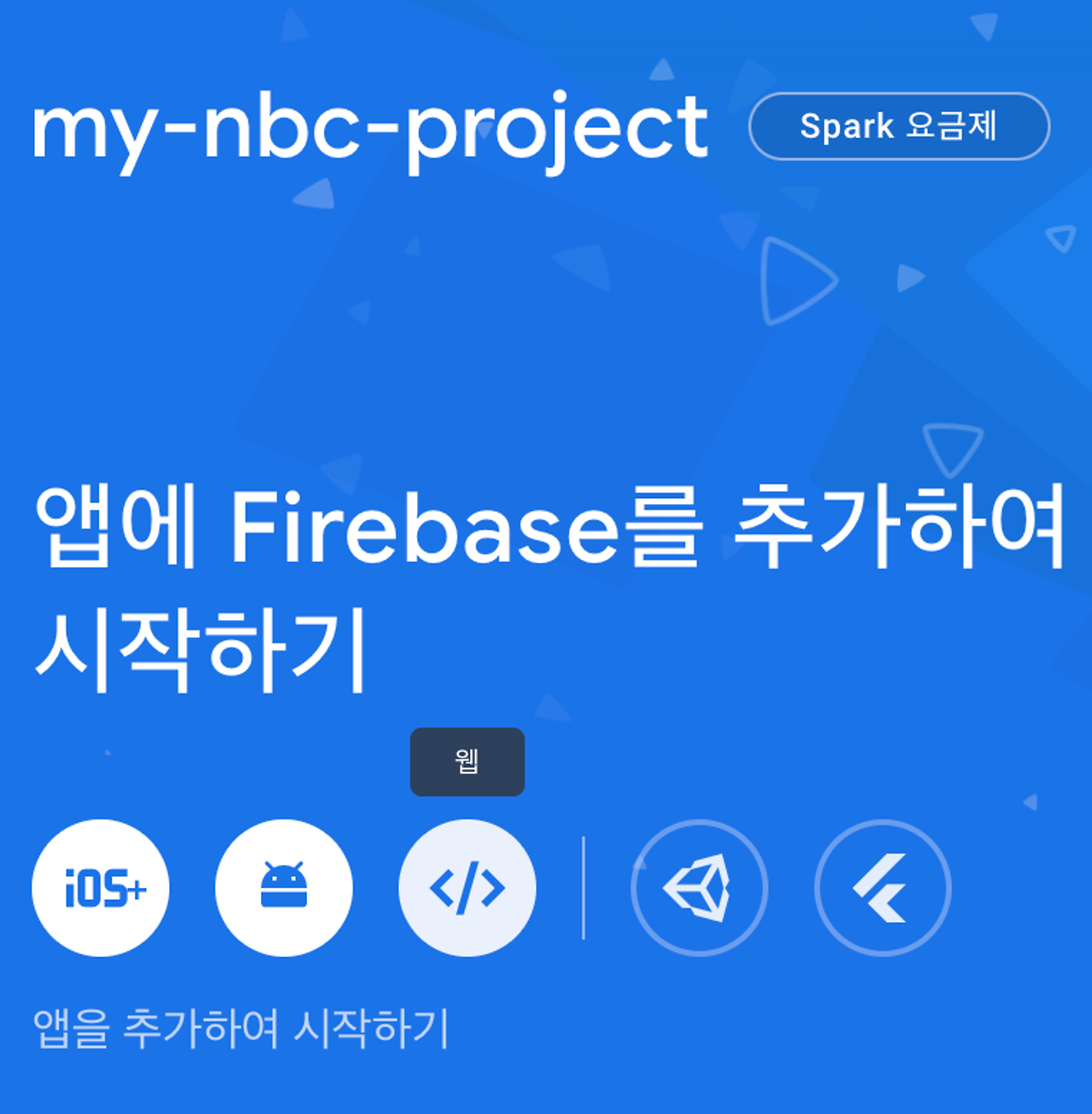 6. 아래 </> 를 클릭하면 웹 앱을 만들 수 있다 (Firebase 호스팅은 체크하지 않음 )