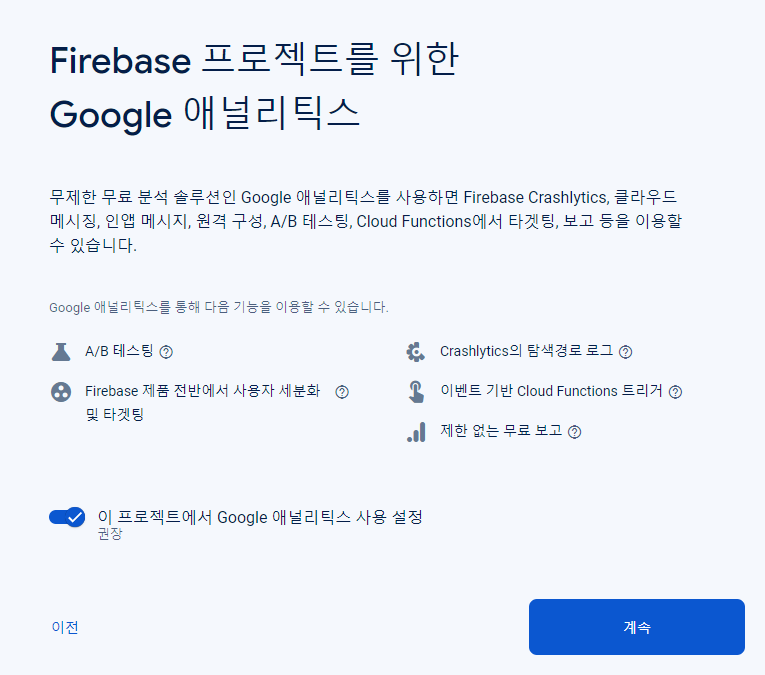 4. 구글 애널리틱스 사용여부 확인 (뉴스피드 프로젝트의 경우, 체크 해제함)